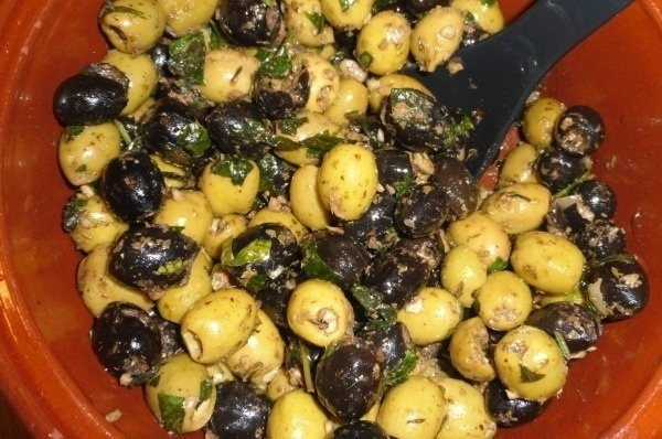 Gemengde zwarte en groene olijven met knoflook, basilicum en peterselie.