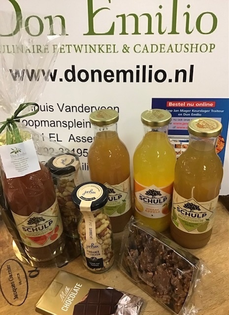 Leuk pakket met: Fles Sap (keuze uit: Sinaasappel, peer, appel) Flesje nootjes Reep chocolade Pindarotsjes